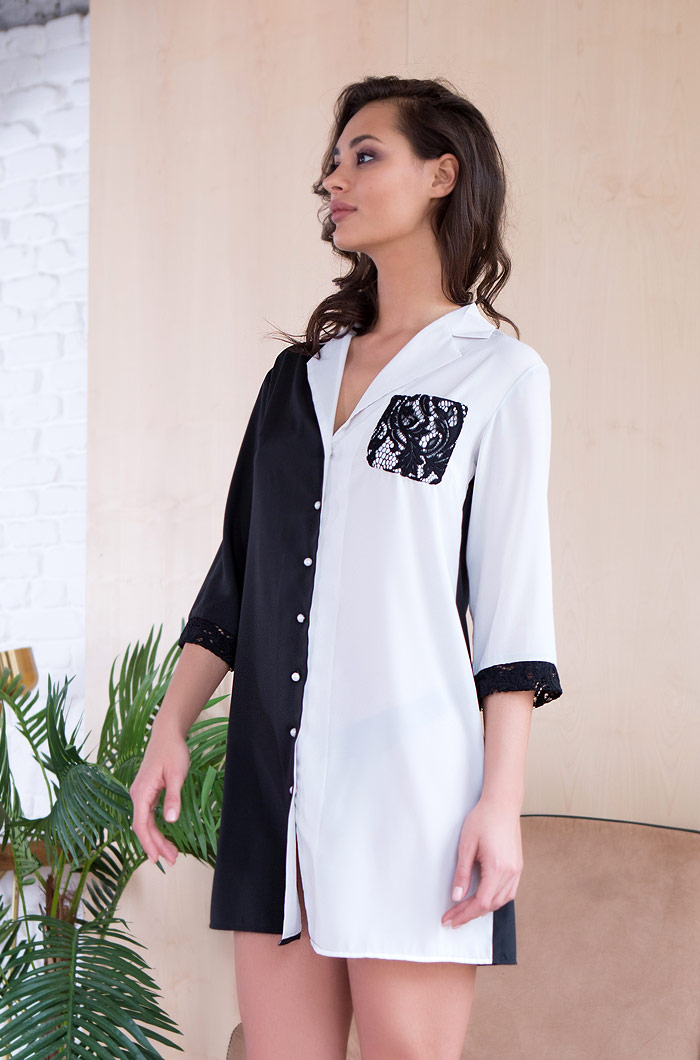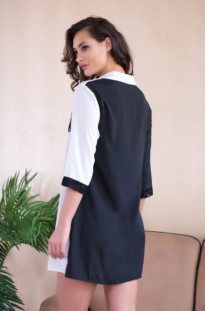 Туника домашняя женская Mia-Mia выполнена из сочетания белого и черного крепа. Туника рубашечного типа свободного силуэта. Изделие длиной до колена. Рукав длиной 3/4 окаймлен кружевом. Модель с отложным воротником и функциональной планкой на пуговицах.