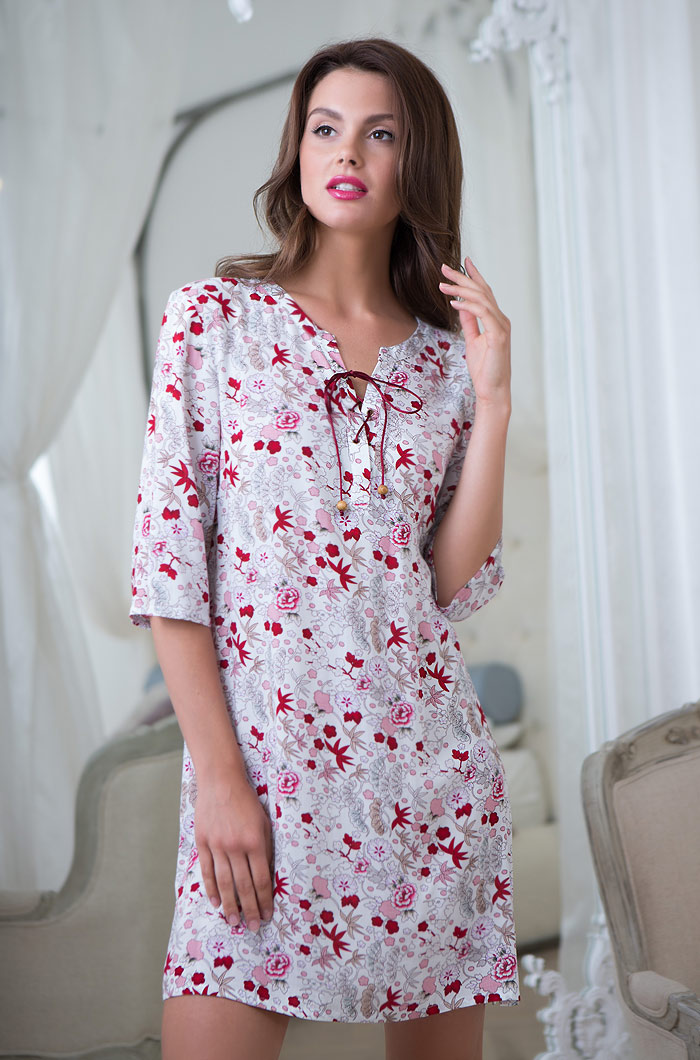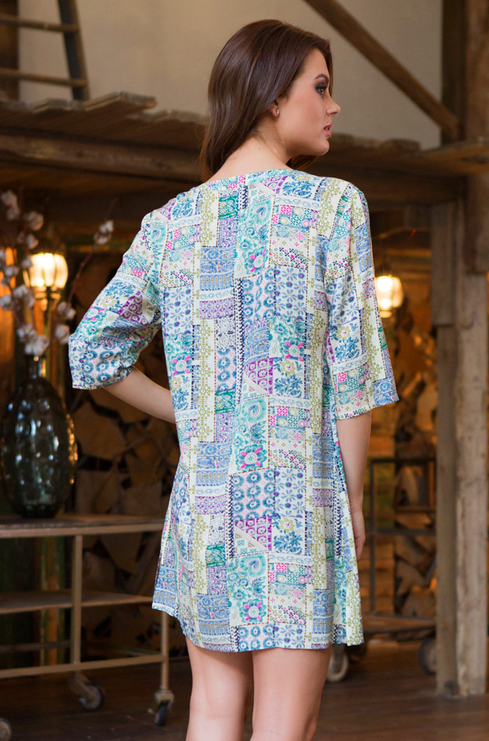 Туника Mia-Mia из принтованной вискозы средней длины. Изделие прямого силуэта с круглым вырезом горловины на полочке и спинке. Модель с втачными широкими рукавами и боковыми разрезами. Круглый вырез горловины полочки и спинки из обтачки в цвет изделия. Планка на полочке имеет люверсы с продернутым атласным шнуром.
