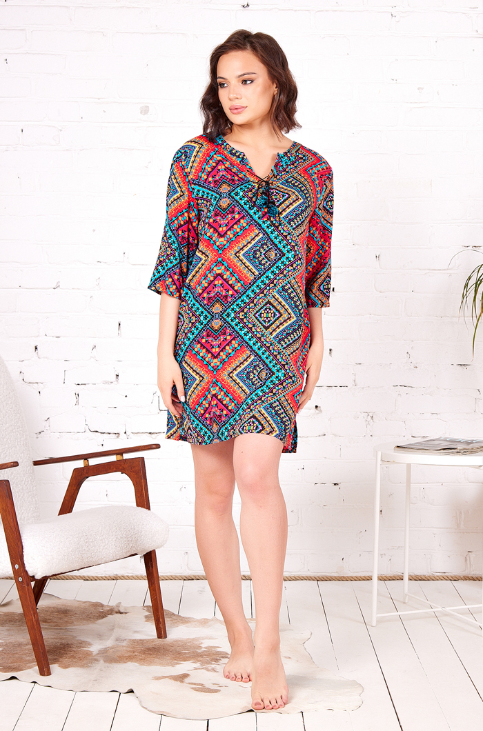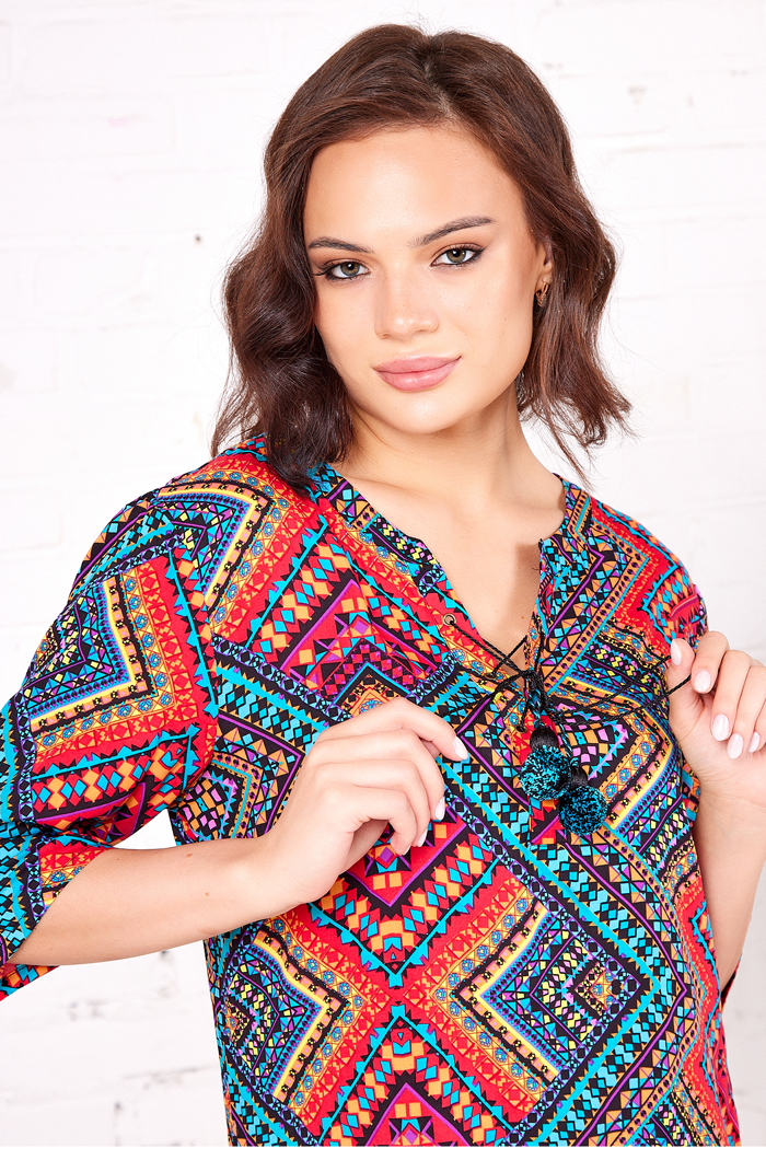 Туника Миа-Миа средней длины прямого силуэта с круглым вырезом горловины на полочке и спинке из принтованной вискозы. Модель с втачными широкими рукавами и боковыми разрезами. Круглый вырез горловины полочки и спинки обработан притачной фигурной обтачкой. V-образный разрез на горловине полочки обработан притачной планкой. Планка туники декорирована тонким шнурком, который продергивается через люверсы.