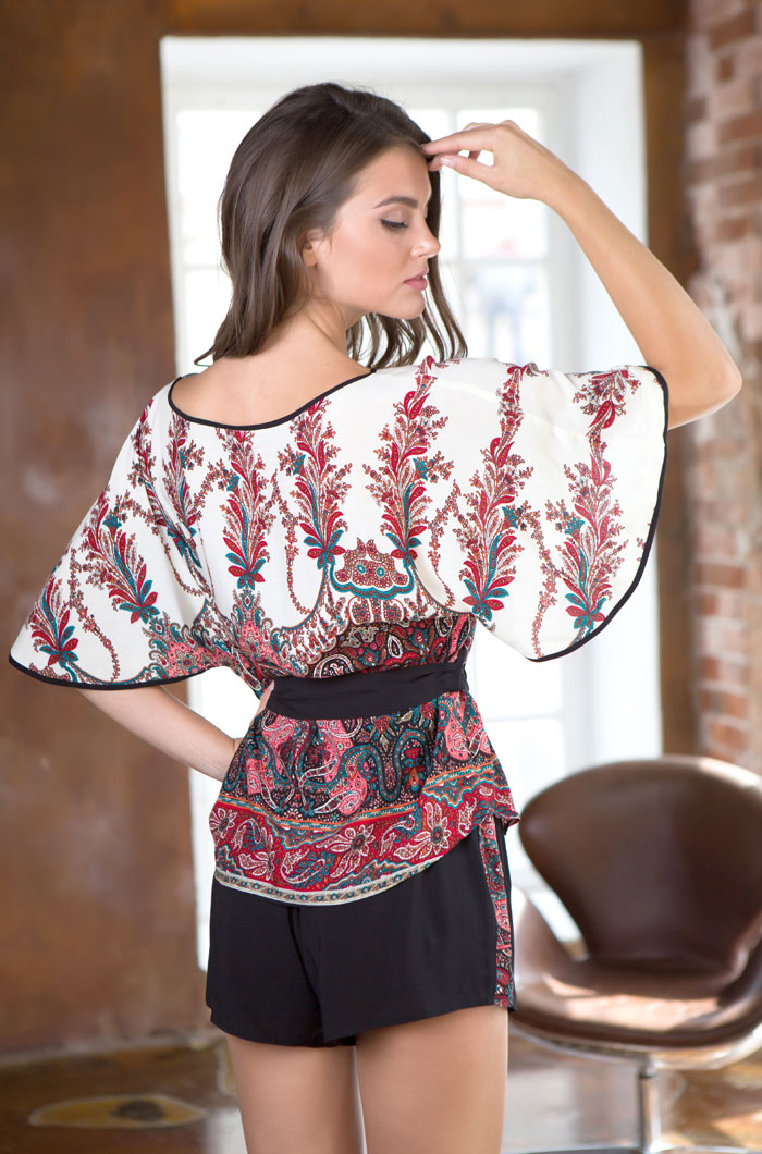 Комплект Миа-Миа состоящий из блузы и шорт на эластичной тесьме (резинке) в поясе. Блуза выполнена из вискозы с фантазийным принтом. Модель с цельновыкроенными широкими рукавами и вырезом горловины "лодочка". Горловина полочки и спинки, а так же низ рукавов окантованы однотонным кантом