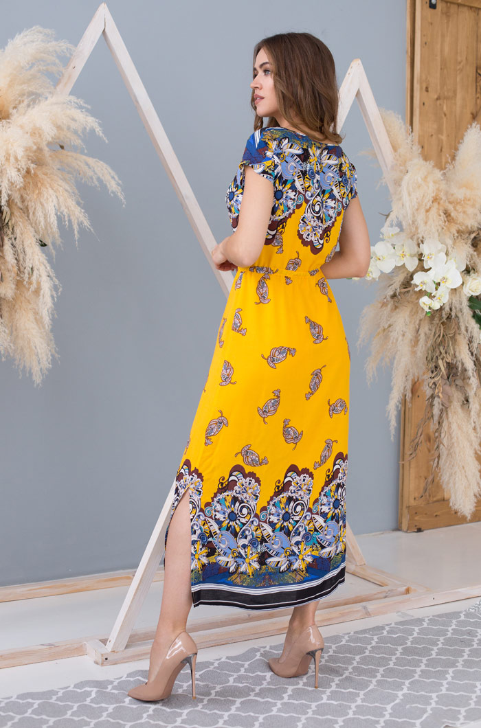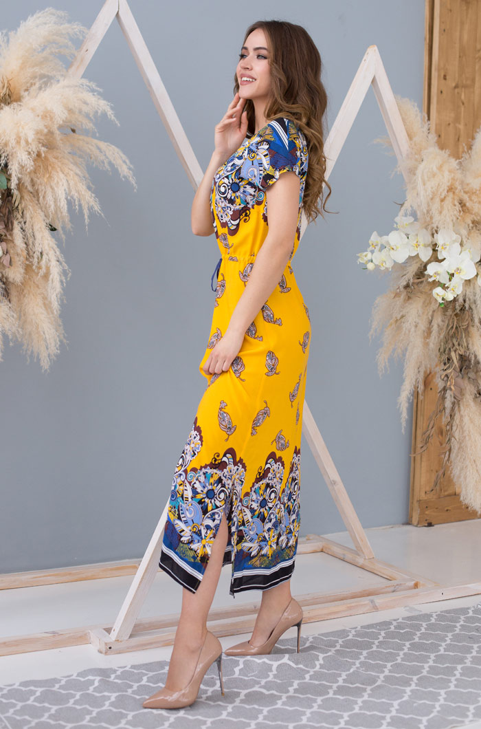 Длинное платье Mia-Mia приталенного силуэта из принтованной вискозы. На поясе имеется кулиска с регулировкой для точного силуэта. Рукав короткий, цельнокроеный . Разрезы по боковым швам.